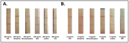 Interferences and cross-reactivity results (A) MET strips; (B) COC strips.