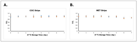 Accelerated aging test (A) COC strips and (B) MET strips.