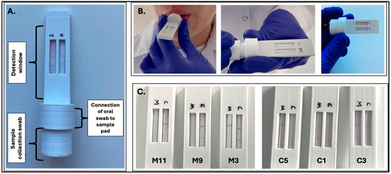 (A) Test kit prototype. (B) Sample collection and application process (C). Test results of positive samples by test prototype.