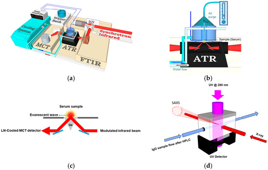 The schematic optical layout of the FTIR spectrometer, ATR accessory, and sample cell for the measurement of X-ray scattering. (a) The setup of the ATR-FTIR and temperature control systems for acquiring spectra of serum samples during dehydration. (b) The liquid serum sample loaded on the surface of the ATR germanium (Ge) crystal, which is mounted on a stainless steel disc and purged with a continuous flow of dry nitrogen. (c) The optical path of the evanescence wave of the modulated mid-IR beam as it propagates through the serum sample. (d) The sample cell is designed to collect small-angle X-ray scattering from IgG antibodies at TPS 13A1 of NSRRC. The IgG sample was purified using HPLC and detected by a UV detector to determine the IgG concentration.