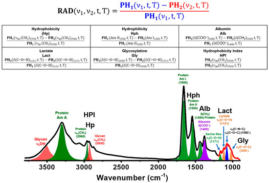 In the RAD equation (see Equation (1)), the reference spectral intensities for the absorption bands should remain nearly unchanged or unaffected by the chemical modifications of the components and the absorption bands at nearby wavenumbers (Figure 4). This approach minimizes background fluctuations in the RAD temporal profile during serum dehydration. For each RAD equation, the intensity reference of the absorption band includes the methyl group νas(CH3) at 2960 cm−1 for Hp, the amide I band at 1650 cm−1 for Hph, the methylene group δ(CH2) at 1450 cm−1 for Alb, and the δ(C-O-H) bands at 1171 cm−1 for Lact and Gly.