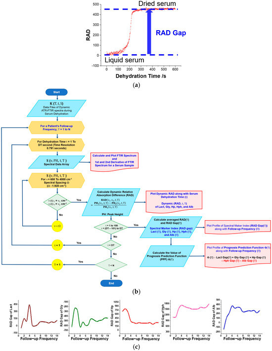 (a) A representative temporal RAD profile and RAD gap during serum dehydration. (b) Flowchart illustrating the data processing steps for temporal RAD and RAD gap determination during serum dehydration, and the calculation of PPF values for each follow-up visit. (c) Representative RAD gap profiles of Lact, Gly, Hp, Hph, and Alb of patient P1 throughout the study.