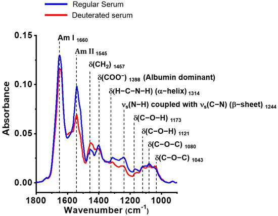 Furthermore, the absorption in the spectral range of 1350–1200 cm−1 is assigned to the amide III band of serum protein, reflecting protein secondary structures. The absorption bands at approximately 1315 cm−1 and 1240 cm−1 are attributed to N-H in-plane bending coupled with C-N stretching, indicative of the protein secondary β-sheet structure, and the rocking vibration of the H-N(C=O) C-H fragment of the α-helix structure within the peptide framework [42,43,44].