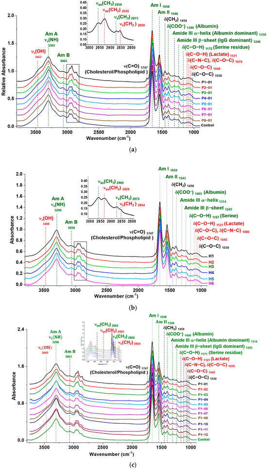 Representative FTIR spectra of dehydrated serum samples: (a) SLE patients with class IV LN (P1-01 to P8-01) and the averaged spectrum of 6 healthy cases as the control. (b) Healthy controls (H1-H6), and (c) serial serum spectra (P1-01 to P1-12) and the control illustrating changes from patient P1 diagnosed with acute cLN over the treatment period following the initial diagnosis. The red inset shows the assignment of the absorption peaks in the spectral range of 3000–2800 cm−1. Each serum spectrum underwent ATR correction, baseline correction, and normalization. (Note: P1-01 to P8-01 represent the first sample collected and analyzed after enrollment in the study; P1-01 to P1-12 present serum samples collected from patient P1 from day 0 to day 1191).
