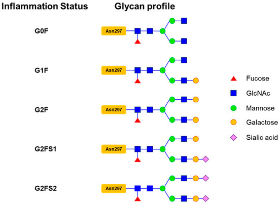 The schematic diagram illustrates the structure of the Asn-297 glycan residue of IgG and outlines the progression of glycosylation changes across various states of inflammation, transitioning from agalactosylated (G0F) to galactosylated (G1F, G2F), and subsequently to fucosylated and sialylated forms (G2FS1, G2FS2). These sequential modifications of the glycan structure highlight the dynamic shifts in agalactosylation, galactosylation, fucosylation, and sialylation.