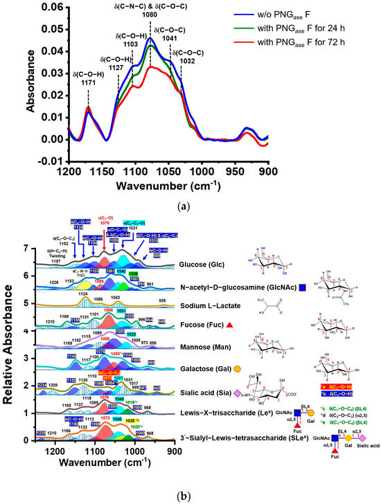 We noted reduced absorption at 1080 cm−1 in the treated serum compared to the untreated serum, indicating the presence of the C-N-C bond formed through condensing the amine of Asn-297 and the hydroxyl residue of IgG glycans (Figure 7a). Thus, our results confirm that the absorption band at approximately 1080 cm−1 primarily originates from the glycan bonding to Asn-297 of IgG. Moreover, the FTIR spectra revealed selected saccharides—such as glucose, N-acetyl-D-galactosamine (GalNAc), N-acetyl-D-glucosamine (GlcNAc), fucose, galactose, sialic acid, Lewis-X-trisaccharide (Lex), and sialyl-Lewis-X-tetrasaccharide (SLex)]—along with sodium L-lactate, within the 1200–900 cm−1 fingerprint region (Figure 7b).