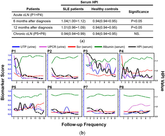 In contrast, chronic cLN patients (P5–P8) undergoing a mycophenolate mofetil-based maintenance IS regimen displayed steady serum HPI values of 0.95 (IQR 0.94–0.99), similar to healthy controls. This consistency was observed regardless of the intensity of immunosuppression or additional biological agents (Figure 8b), even as these patients continued to exhibit proteinuria or impaired renal function. In conclusion, our findings indicate that regular, individualized monitoring of serum HPI and its fluctuations during treatment could provide a straightforward diagnostic approach for assessing treatment response, disease progression, and renal outcomes.