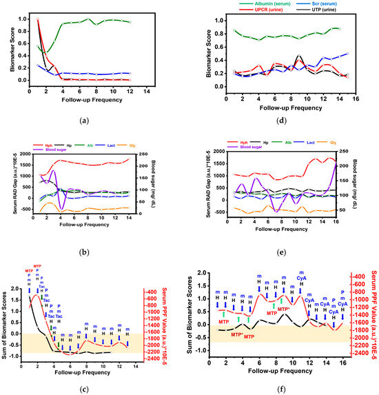 Building on these findings, we introduced a prognosis prediction function (PPF) based on the linear combination of RAD gaps from each spectral marker, as illustrated in Equation (2). This PPF facilitates the rapid evaluation of treatment responses and nephritis status for individual cLN patients at each follow-up (T). Additionally, the normalized values of patient-specific Scr, serum albumin, UTP, and UPCR were combined linearly, as shown in Equation (3), providing a comprehensive framework for monitoring disease progression and therapeutic efficacy.