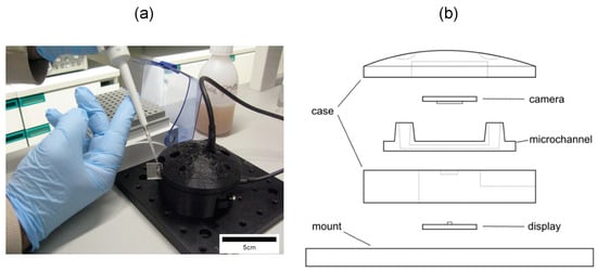Our setup for the MicroVi solution to measure yeast cells in wine samples. (a) A photograph of the MicroVi while being used to prepare a sample of wine to be captured. (b) A schematic representation of MicroVi setup (not to scale), the setup is composed of a plastic case made with a commercial 3D-printed, a microfluidic channel which is a disposable element, a display that acts as the light source for this microscope, and finally, a digital CMOS camera.