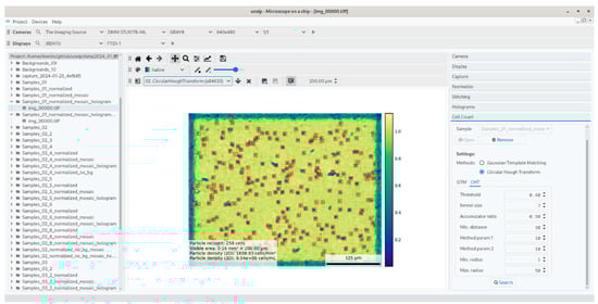 We introduce a novel application to control the device, primarily developed in Python. Python was chosen, due to its versatile approach to different solutions, as a general-purpose language []. Python has access to modern computer vision libraries, and it can bind to popular graphic interface libraries, often written in C or other similar low-level languages, such as PySide2, open-source bindings to the QT framework []. The application views are designed using Qt Designer, and Figure 2 shows the application displaying the camera of the microscope open in a live stream. A summary of stock libraries that we used to implement our acquisition and computer vision pipeline is provided as follows:
