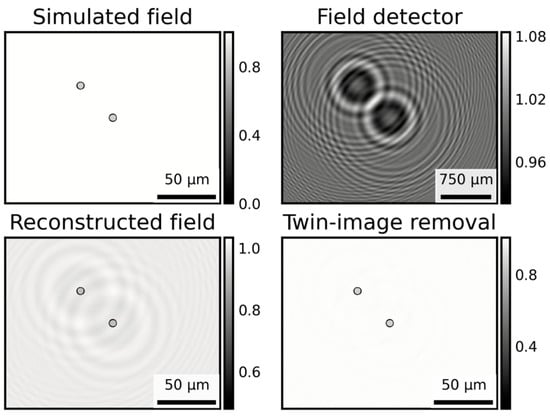 - We multiplied and and calculated the Fourier transform of the result, which provides . The reconstructed field was derived from the holographic reconstruction method, which can be seen as the “Reconstructed field” in Figure 3.
