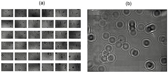 The stitching process of a sample image of Brettanomyces bruxellensis (CECT 1010) in our pipeline: (a) 64 images created changing the addressable LEDs from the microdisplay, and each image is normalized without a background image to enhance the different changes in the illumination; (b) the stitched image using SIFT, BFMatcher algorithms and a bi-linear model to solve the reconstruction of the sample image.