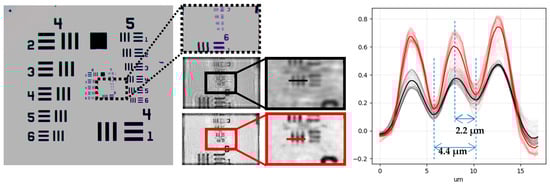 The resolution of the MicroVi device was determined by resolving the well-known USAF Resolving Power Test Target 1951 (see Figure 5). This target is a known reference pattern used by many others in research also related to imaging devices for agricultural applications [,]. The target comprises a series of repeating squared patterns called “groups”. Within each group, a descending amplitude pattern is depicted. With our MicroVi software, we captured an array of 64 images and stitched the image into a mosaic image (similar to Figure 4). Then, we applied a holographic back-propagation to the target plane and implemented the iterative phase-removal algorithm to clean the twin-image noise (similar to Figure 3). The results can be observed in Figure 5. MicroVi was able to qualitatively resolve the sixth pattern of the seventh group from the USAF 1951 (G7.6), which was the smallest feature in our target. Quantitatively, we measured a half-period of the pattern of 2.2 ± 0.1 µm, which was consistent with the tabulated measure of the G7.6 pattern, 2.19 µm.