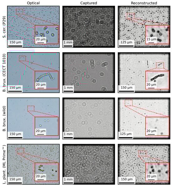 A comparison for different species of yeast cells and lactic acid bacteria. The columns show the same three steps for each species: optical, an image of a sample captured with the optical microscope; captured, the same sample—but not the same spot—captured with the MicroVi microscope, and images are shown as diffraction patterns; reconstructed, holographic reconstructions plus the twin-image removal algorithm. The rows show four different species, three yeast species, the last two contaminant species, and Lactobacillus species, namely, Saccharomyces cerevisiae P29 (CECT 11770 strain), Brettanomyces bruxellensis (CECT 1010 strain), Brettanomyces bruxellensis (wild strain), and Lactobacillus plantarum (ML Prime™ strain).