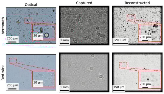 A comparison of the use of MicroVi microscopy for two different commercial samples. The columns show the same three steps for each species: optical, an image of a sample captured with the optical microscope; captured, the same sample—but not the same spot—captured with the MicroVi microscope (the images are shown as diffraction patterns); reconstructed, holographic reconstructions plus the twin-image removal algorithm. The rows show two different commercial samples from vermouth and red wine.