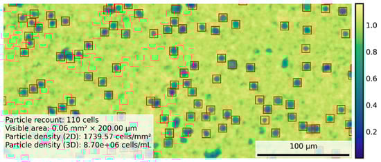 Regarding cell count, an alternative to the CHT method is the well-established YOLO deep learning architecture, which has demonstrated promising results in the detection and counting of other types of cells—e.g., blood cells []. Its implementation within the MicroVi pipeline would require its application to the reconstructed holographic images, where it could potentially detect yeast cells with greater speed and accuracy than CHT. By using YOLO, the system could not only enhance its real-time performance but also reduce the complexity of manually tuning the detection parameters. Despite this, the main issue with YOLO-based architectures is that they need expensive training and dataset labeling.