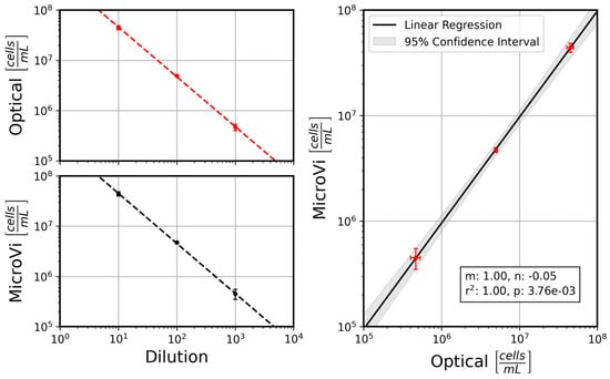 A comparison between the optical microscope and MicroVi (lab-on-a-chip) cell count measurements across dilutions for S. cerevisae (P29 strain) samples. The left column shows the cell count as a function of dilution for both the optical microscope (top) and MicroVi (bottom). The right column shows the linear regression between the two measurement techniques, with MicroVi closely aligning with the optical measurements.