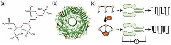 The entry of Fe3+ into the environment occurs through various routes, such as metal mining, industrial waste disposal, and pipe corrosion. While it poses little toxicity to humans and animals, it exhibits lethal effects on microorganisms, thereby impacting water quality and exerting a negative influence on the ecological environment [43]. Meanwhile, Fe3+ plays crucial roles in biological and metabolic processes, such as electron transfer reactions, oxygen transfer, and DNA synthesis. Hence, it is presented in nutrition products [44]. Recently, Guan’s group put forward a ligand–probe-based approach for quantifying Fe3+ in M113K α-hemolysin (αHL) nanopores, which was predicated on the chelation interaction between Fe3+ and Diethylenetriaminepenta (methylenephosphonic acid) (DTPMPA) (Figure 1) [45]. Owing to the negatively charged nature of DTPMPA, the anionic selectivity of nanopores was significantly enhanced by substituting methionine with lysine at position 113. In the absence of Fe3+, DTPMPA exclusively translocated through nanopores, inducing typical events with a mean residual current (Ib) of 4.5 ± 1.2 pA and residence time (τoff) of 31.2 ± 4.9 ms. Conversely, in the presence of Fe3+, the formation of DTPMPA-Fe3+ complexes resulted in a distinct net charge, yielding a novel type of event characterized by Ib = 14.3 ± 0.8 pA and τoff = 3.2 ± 0.5 ms. This sensor demonstrated a detection limit (LOD) of 0.28 μM for Fe3+. Although DTPMPA was acknowledged as a chelator for multiple metal ions, other metal ions exhibited distinct phenomena in simultaneous measurements (Zn2+: Ib = 5.3 ± 0.4 pA, τoff = 23.6 ± 4.5 ms; Ni2+: Ib = 7.0 ± 1.2 pA, τoff = 6.9 ± 0.3 ms; and Co2+: Ib = 6.5 ± 1.8 pA, τoff = 91.3 ± 3.4 ms), which was accountable for the presence of the His-tags near the mushroom cap of nanopores. It should be noted that nanopores facilitated the discrimination of distinct interactions between targets and ligands, which enabled the simultaneous detection of multiple metal ions. In Asandei’s study, they found that Cu2+, Zn2+, Fe3+, and Al3+ presented various interactions with amyloid-β1–16 peptides [46].