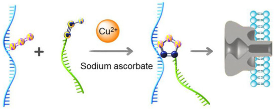 Metal ions potentially function as catalysts in chemical reactions, offering an innovative approach to their detections. For example, Liu L. et al. integrated click reactions into nanopore sensing to quantify Cu2+ [47]. Copper is an essential trace element in human physiology; however, excessive intake will result in gastrointestinal dysfunction, kidney damage, and neurodegenerative disorders [48,49]. As illustrated in Figure 2, the scheme comprised three steps as follows: 1. the reducing agent facilitated the conversion of Cu2+ to Cu+; 2. Cu+ activated the click reaction between two distinct types of ssDNA segments; and 3. nanopore analysis. The presence of Cu2+ facilitated the formation of forked DNA through the cycloaddition of azides and alkynes, which induced events with a current blockage (Ib/I0) of 85% and a dwell time (τoff) of 1.19 ± 0.12 ms. Conversely, in the absence of Cu2+, no click reaction occurred and thus the events of ssDNA segments were observed (Ib/Io = 30% and τoff = 0.16 ± 0.01 ms). Given that other metal ions (Al3+, Fe3+, Cr3+, Cd2+, Mg2+, Zn2+, Ca2+, Fe2+, Mn2+, Co2+, K+, and Na+) failed to activate click chemistry within this context, this sensor demonstrated exceptional selectivity with the LOD reaching 67 pM. In another study, Zhang Z. et al. opted to graft ferrocene⊂cucurbit[7]uril onto DNA segments by click reaction, enabling the quantification of Cu2+ as well [50]. It is worth mentioning that the click reaction enhanced the morphology of probes, which significantly improved the resolution of typical events in nanopores.