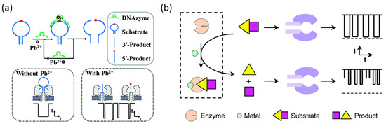 (a) Schematic illustration of the proposed label-free DNAzyme-based nanopore biosensor for Pb2+ detection. The target Pb2+ can trigger the DNAzyme catalysis cleavage reaction and release ssDNA products. Copyright © The Royal Society of Chemistry 2016. (b) Schematic representation of the enzymatic reaction-based nanopore detection of metal ions; without the target metal ions, the enzyme is inactive so that the current modulations are caused only by the peptide substrate, and with the analyte in the solution, the enzyme is activated and the cleavage of the peptide substrate by its corresponding enzyme produces new types of blockage events [51,52]. Copyright © The Royal Society of Chemistry 2019.