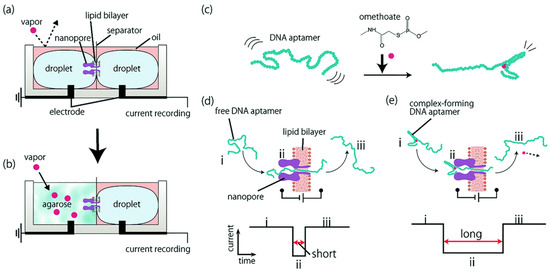 Schematic of the VOC nanopore sensor. (a) Formation of a lipid bilayer holding the nanopore by the general droplet contact method. (b) Modified agarose gel-based device for VOC absorption. (c) Formation of a rigid complex of the DNA aptamer and omethoate. (d) Free DNA aptamers translocate through the nanopore smoothly, whereas (e) the omethoate–DNA aptamer complexes are clogged due to the rigid secondary structure. Conceptual image of the DNA aptamer before (i), during (ii), and after (iii) translocation through the nanopore [62]. Copyright © The Royal Society of Chemistry 2017.