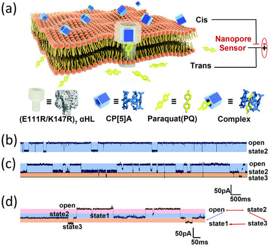 Paraquat (PQ) is another highly toxic pesticide that, due to its frequent usage, causes environmental pollution and food toxicity, thereby posing severe threats to ecosystems and human health. Due to the weak interactions between nanopores and PQ, host–guest interaction was integrated with nanopores. The host molecules employed in Jiang’s study were CP[5]A, which was a type of pillar[5]arene (P[5]A) with upper and lower rims modified with five carboxyl groups [64]. The presence of CP[5]A in (E111R/K147R)7 αHL nanopores would induce two types of events, namely State 1 (ΔI0–1/I0 = 0.17 ± 0.05 and τoff1 = 0.13 ± 0.04 ms) and State 2 (ΔI0–2/I0 = 0.33 ± 0.04 and τoff2 = 116.25 ± 0.05 ms), corresponding to random collisions and binding interaction, respectively. However, when both CP[5]A and PQ were present, a third type of event occurred, characterized by a current blockage of 0.48 ± 0.03 and a mean residence time of 9.91 ± 0.16 ms (Figure 6). These events exhibited dependence on PQ concentration and allowed for the determination of the LOD for PQ at 0.37 ppb, which was lower than the maximum residue limit of China’s National Food Safety Standard in food (62.5 ppb). In some cases, certain analytes may be too small or weak to elicit interactions with nanopores; thus, the incorporation of host–guest interactions allows for the construction of a sub-channel, facilitating the indirect interaction between nanopores and analytes.