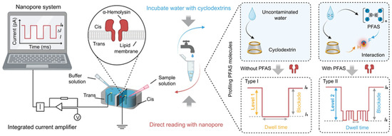 Schematic illustration of the experimental setup (left) and the CD-mediated nanopore assay workflow for profiling PFAS molecules (right). (Left) A nanopore system. An α-HL protein nanopore is inserted into a lipid bilayer membrane suspended across the 200 μm aperture on a Delrin wall that divides a chamber into two compartments, which are cis and trans. A command voltage is applied on the trans side, and the cis side is grounded. An integrated current amplifier is used for measuring transient current blockages caused by the translocation of sample molecules after adding the sample into the cis side. (Right) PFAS molecule profiling. The samples are achieved by incubating water possibly containing PFAS with CD, followed by the nanopore measurement of current blockage events for PFAS profiling and quantification [67]. Copyright © 2024 The Authors.