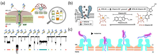 Vitamin Bs are a group of small organic molecules that are essential exogenous nutrients for the human body. They were found to have extensive applications as nutritional supplements in health products, pharmaceuticals, and beverages. In nanopores, various strategies have been proposed to quantify vitamin Bs. For example, Maglia’s group utilized Cytolysin A (ClyA) nanopores to monitor the current fluctuations in the concentration of vitamin B1 and its binding protein [76]. Recently, a noteworthy study was conducted by Huang’s group, wherein they functionalized MspA nanopores to identify multiple vitamins Bs, including vitamin B1 (thiamine (T)), vitamin B3 (nicotinic acid (NA) and nicotinamide (NAM)), vitamin B5 (pantothenic acid (PA)), and vitamin B6 (pyridoxal (PL), pyridoxine (PN), and pyridoxamine (PM)) [74]. In Figure 8b, a nickel ion-bound nitrilotriacetic acid (NTA-Ni) adapter was modified at the 90th position of MspA nanopores, which presented different percentages of blockage of events (%Ib = (Ib − I0)/I0) towards vitamin Bs (T: 0.335 ± 0.010; NA: 0.566 ± 0.06; NAM: 0.434 ± 0.012; PA: 0.64 + 0.02; PL: 0.491 ± 0.005; PN: −0.559 ± 0.014; and PM: −0.304 ± 0.011, respectively). The negative values of PL and PN were attributed to spontaneous switching between analyte configurations. Although this sensor presented a millimolar level of LOD (T: 0.9 mM; NA: 0.02 mM; NAM: 0.02 mM; PA: 20 mM; PL: 2 mM; PN: 0.04 mM; and PM: 0.4 mM, respectively), it achieved the detection of vitamin Bs in cosmetic products and natural food with the assistance of a machine learning algorithm. The chemical modification offered protein nanopores enhanced selectivity to analytes. Beyond this study, this strategy has been applied for multiple purposes, such as saccharides [77], ribonucleotides [78], and amino acids [79].