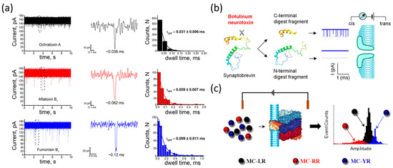 Microcystins (MCs), whose general structures are cyclo(-D-Ala1-L-X2-D-erythro-β-methylAsp(iso-linkage)3-L-Z4-Adda5-D-Glu(iso-linkage)6-N-methyldehydro-Ala7), contaminate water and upset the balance of ecology, posing a threat to human and animals [88]. The maximum allowable concentration of these toxins in drinking water, as determined by the World Health Organization, is 1 μg/L. The MC variants were successfully detected by Zhou and Junior in αHL nanopores under varying experimental conditions, respectively [85,89]. MC-RR, MC-LR, and MC-YR are three distinct types of MCs that exhibit variations in L-amino acid composition. Since MC molecules are too large to translocate through αHL nanopores, collision events were collected. In Zhou’s study, these three molecules were measured using 1 M NaCl buffer solution and exhibited characteristics (MC-RR: I/I0 = −13.11 ± 0.10 pA, τoff = 0.37 ± 0.04 ms; MC-LR: I/I0 = −8.66 ± 0.02 pA, τoff = 1.02 ± 0.08 ms; and MC-YR: I/I0 = −5.78 ± 0.04 pA, τoff = 2.08 ± 0.13 ms). Given that MCs are cyclic heptapeptides, enzyme reactions could be employed to generate linear analogs, thereby offering a novel approach to MC identification (Figure 9c). Due to the varying charges of MC-LR, MC-RR, and MC-YR, Junior et al. utilized 4 M LiCl buffer solutions to shield the charges of the stem region of the nanopores. As a result, the residence time of MC-RR decreased while that of MC-LR increased. It should be noted that the electrostatic interaction significantly influenced the performance of nanopores. In another study, our group reported the detection of MC-LR by an aptamer-based approach in solid-state nanopores [90].