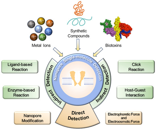 The schematic illustration of nanopore single-molecule detection in environmental and food surveillance employing different detection strategies.