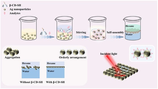 A schematic illustration of the uniform formation of a Ag monolayer film under the assistance of β-CD-SH and the SERS detection process is depicted in Figure 1. After the addition of the organic phase to the Ag NP sol, the self-assembly process is initiated, simultaneously enabling the capture of test molecules. The addition of ethanol as a cosolvent is crucial to initiate the self-assembly process. However, it reduced retention of Cl− on the surface of Ag NPs due to competitive adsorption and thus decreased electrostatic repulsion [,], causing aggregation of Ag NPs at the two-phase interface. This resulted in poor stability and uniformity of the assembled Ag monolayer film. The introduction of β-CD-SH into the system forms stable silver/sulfur bonds by means of its thiol groups with Ag NPs, while the rigid cavity structure at the other end maintains partial electrostatic repulsion, preventing the aggregation of Ag NPs [,]. Consequently, the assembled Ag NP film exhibits excellent uniformity and stability.