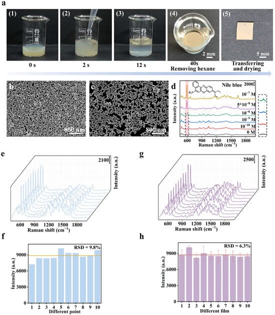The entire self-assembly process requires only approximately 40 s and eliminates the need for tedious pretreatment and complex substrate preparation procedures (Figure 2a). Following the evaporation of hexane, the film can be rapidly transferred onto a silicon wafer surface. The optimal concentration of β-CD-SH is 10−5 M, at which Ag NPs are densely packed into a monolayer, forming a continuous macroscopic film (Figure 2b).