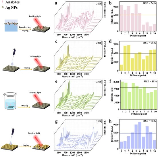 (a) SERS spectra of 10−7 M NB collected from 10 random points on a monolayer film (without β-CD-SH modification), (b) Intensity of the 593 cm−1 peak at 10 random points on the substrate (without β-CD-SH modification), (c) SERS spectra of NB (10−7 M) at 10 random points on a β-CD-SH-Ag film detected by droplet application, (d) Intensity of the 593 cm−1 peak at 10 random points on a β-CD-SH-Ag film detected by droplet application, (e) SERS spectra of NB (10−7 M) at 10 random points on a β-CD-SH-Ag film detected by soaking, (f) Intensity of the 593 cm−1 peak at 10 random points on a β-CD-SH-Ag film detected by soaking, (g) SERS spectra of NB (10−7 M) at 10 random points on a PVP-Ag film detected by droplet application, and (h) Intensity of the 593 cm−1 peak at 10 random points on a PVP-Ag film detected by droplet application.
