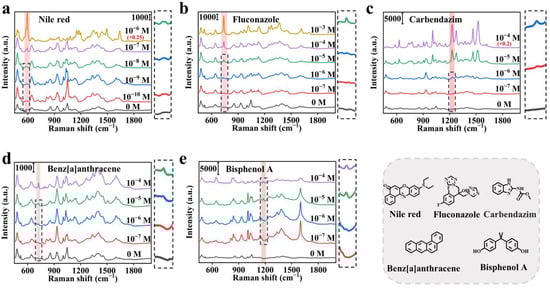 Detection generality of hydrophobic analytes was evaluated. In the detection of Nile Red (ring II breathing + β(C-CO-C) ring III at 592 cm−1) [], the characteristic peaks could be identified at a concentration as low as 10−9 M (Figure 4a). For fluconazole, carbendazim, benzo[a]anthracene, and bisphenol A as typical hydrophobic organic pollutants with inherently low Raman activity, the detection limits could even reach 10−6 M with their characteristic peaks (Figure 4b–e) [,,,]. Specifically, in fluconazole, the 739 cm−1 characteristic peak corresponds to the vibration of the γ-CH group in the aromatic ring. In carbendazim, the characteristic peak at 1225 cm−1 is associated with the in-plane bending vibration of the N-H bond. In benzo[a]anthracene, the peak observed at 723 cm−1 is attributed to the νC-CδC-C group. In bisphenol A, the characteristic peak at 1172 cm−1 reflects the vibration of para-substituted benzene.