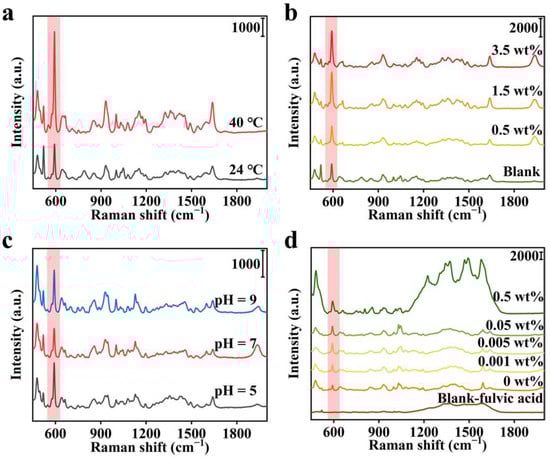 SERS spectra of NB released from PMMA under the influence of different (a) temperatures, (b) salinities, (c) pH values, and (d) concentrations of fulvic acid.