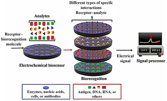 Electrochemical biosensors are highly sensitive analytical tools relying on the interaction between a specific biological agent and the target analyte [1,2,3,4]. These biological agents, including enzymes, antibodies, proteins, nucleic acids, cells, or receptors, provide exceptional selectivity, enabling precise detection of target substances. The operating principle of these devices involves the conversion of biochemical signals from the interaction between the analyte and the biological agent into measurable electrical responses, thereby providing a quantitative readout of the analyte concentration [3,4,5,6]. Figure 1 illustrates a general schematic of the action mechanism of an electrochemical biosensor.