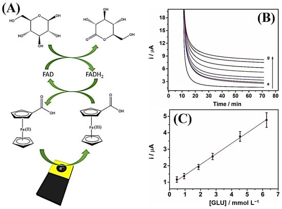 (A) Representation of the GOx biosensor in two steps to convert glucose into glucolactone. (B) Amperometric curves obtained in the presence of glucose (a: 0; b: 0.5; c: 1.0; d: 1.8; e: 2.8; f: 4.6 and g: 6.3 mmol L−1). (C) Linear regression obtained from limit current versus glucose concentration. Copyright (2020), ELSEVIER [48].