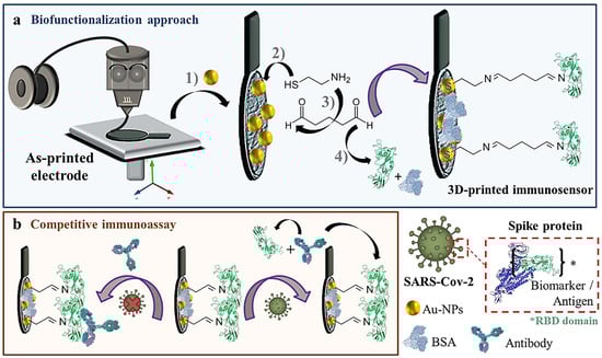(a) Illustration of the 3D-printed electrochemical COVID-19 immunosensor fabrication steps, (1) in situ incorporation of gold nanoparticles, (2) anchoring of a thiolated moiety, (3) anchoring of the cross-linker, and (4) immobilization of biomarker and bovine serum albumin blocking. (b) Indirect competitive assay carried out for detecting the COVID-19 recombinant protein (antigen), the one against the SARS-CoV-2 virus. * COVID-19 Spike Protein RBD Domain Coronavirus. Copyright (2021), ELSEVIER [39].