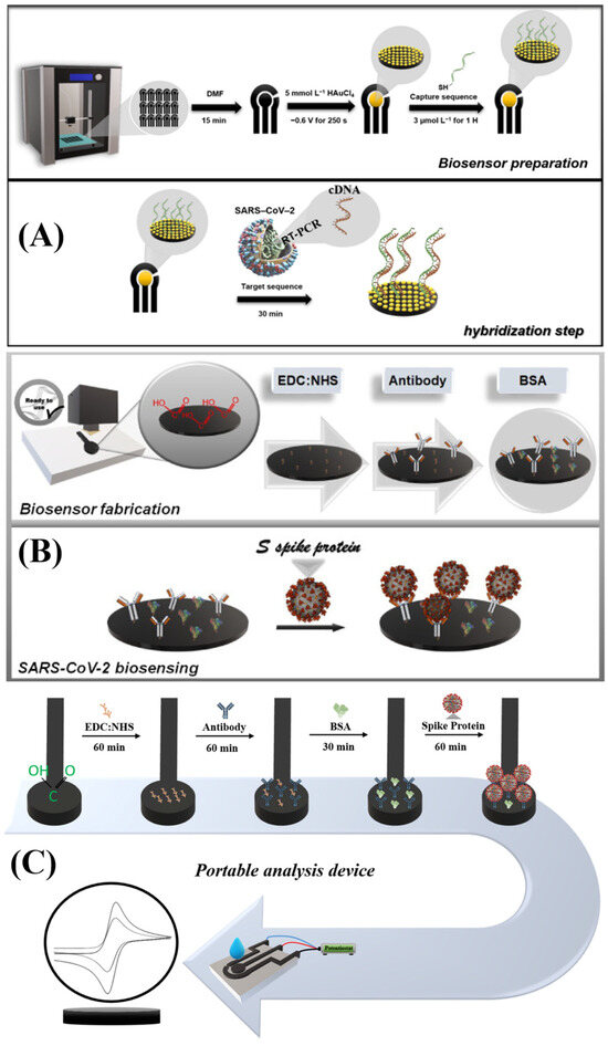 The development of 3D-printed electrochemical biosensors for virus detection beyond SARS-CoV-2 has also been investigated. Martins et al. (2021) [57] presented the first 3D-printed electrochemical immunosensor using commercial carbon black and PLA filament to detect the nucleoprotein of Hantavirus Araucaria. The recognition biomolecule was anchored on the filament surface through EDC/NHS coupling, demonstrating the device’s potential for the quantitative detection of the nucleoprotein in diluted human serum samples. The use of PLA-based conductive filaments with carbon black, featuring carboxyl groups that enable the covalent anchoring of biomolecules, provides a simple and efficient platform for immunosensors. Customized conductive filaments have also been employed in biosensors for the detection of other viruses. Kalinke et al. (2023) [43] utilized recycled PLA, carbon black, and carbon nanotubes (COOH-MWCNT) to fabricate a high-performance genosensor for detecting cDNA from the yellow fever virus in human serum samples. Silva et al. (2024) [37] developed a multiplexed platform based on two 3D-printed biosensors for detecting biomarkers of the monkeypox virus, including a genosensor for target DNA and an immunosensor for the A29 protein. The multiplex device represents a promising alternative for rapid and portable point-of-care detection. Figure 9 illustrates the construction steps of the biosensors discussed in each study.