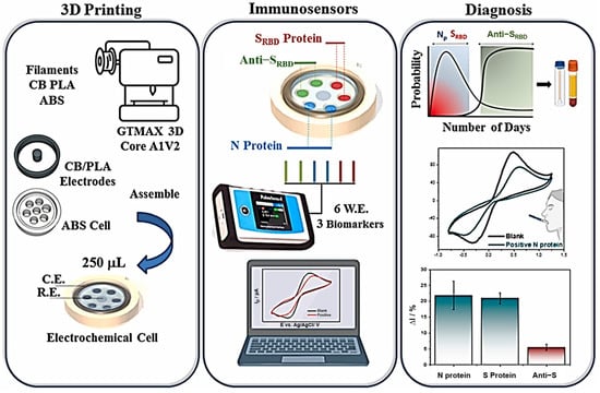 Morawski et al. (2023) [40] developed a 3D-printed electrochemical biodevice consisting of six working electrodes for the simultaneous detection of three SARS-CoV-2 virus biomarkers. The sensors were fabricated using a commercial carbon black and PLA-based filament, and analyses were performed with a 250 µL aliquot. Figure 6 illustrates the steps involved in the process. The biomarkers detected were the N-protein, the SRBD-protein, and anti-SRBD. The sensor demonstrated good selectivity for analyzing these biomarkers and was also effective in analyzing fortified human serum. This device highlights the potential of 3D printing, combined with conductive filaments, for producing complex and multiplex devices.