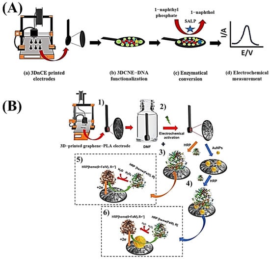 (A) Schematic representation of the analytical protocol for production of biosensor. (B) Scheme of 3D graphene-PLA biosensor fabrication, (1) 3D printing of the electrode; (2) activation in DMF and via electrochemical methods; (3) modification of the 3D-printed electrode with the HRP enzyme; (4) functionalization of the electrode with gold nanoparticles, followed by immobilization of the HRP enzyme, (5) and (6) are corresponding mechanisms of H2O2 detection. (A) Copyright (2023), ELSEVIER [60]. (B) Copyright (2020), ELSEVIER [47].