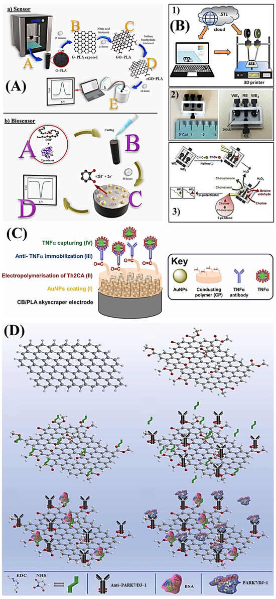 Silva et al. (2020) [49] developed a compact electrochemical biosensor printed in 3D using commercial graphene and PLA filaments, creating a rGO-PLA electrode for catechol determination. The working electrode was modified with a layer of dihexadecyl phosphate enzyme. Koukouviti and Kokkinos (2021) [50] created a four-electrode biochip printed in 3D with carbon black and PLA filaments, capable of simultaneously detecting cholesterol and choline in a drop of blood, offering detection limits below cutoff levels for coronary syndromes. Hussain et al. (2024) [56] designed a robust sensor using 3D printing to create electrode structures resembling skyscrapers, immobilizing anti-TNFα and gold nanoparticles; this sensor was capable of monitoring levels of tumor necrosis factor-alpha (TNFα) in fecal pellets. Kalinke et al. (2023) [61] developed a 3D-printed electrode array from commercial graphene and PLA conductive filaments for detecting PARK7/DJ-1 protein in serum and cerebrospinal fluid samples, using chemical and electrochemical activation to enhance antibody immobilization, showing good repeatability and reproducibility for diagnosing Parkinson’s disease. These advancements demonstrate the potential of 3D printing in the creation of cost-effective, sensitive, and adaptable sensors and biochips. Figure 8 illustrates the construction steps of the biosensors discussed in each study.