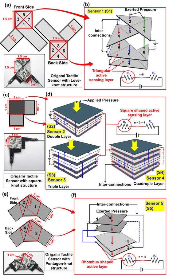 - Karmakar, R.S.; Huang, J.-F.; Chao, J.-I.; Liao, Y.-C.; Lu, Y.-W. Origami-Inspired Tactile Sensors Based On Electrical Contact Resistance (Ecr) For Wearable Applications. In Proceedings of the 2024 IEEE 37th International Conference on Micro Electro Mechanical Systems (MEMS), Austin, TX, USA, 21–25 January 2024; pp. 829–832. [Google Scholar]