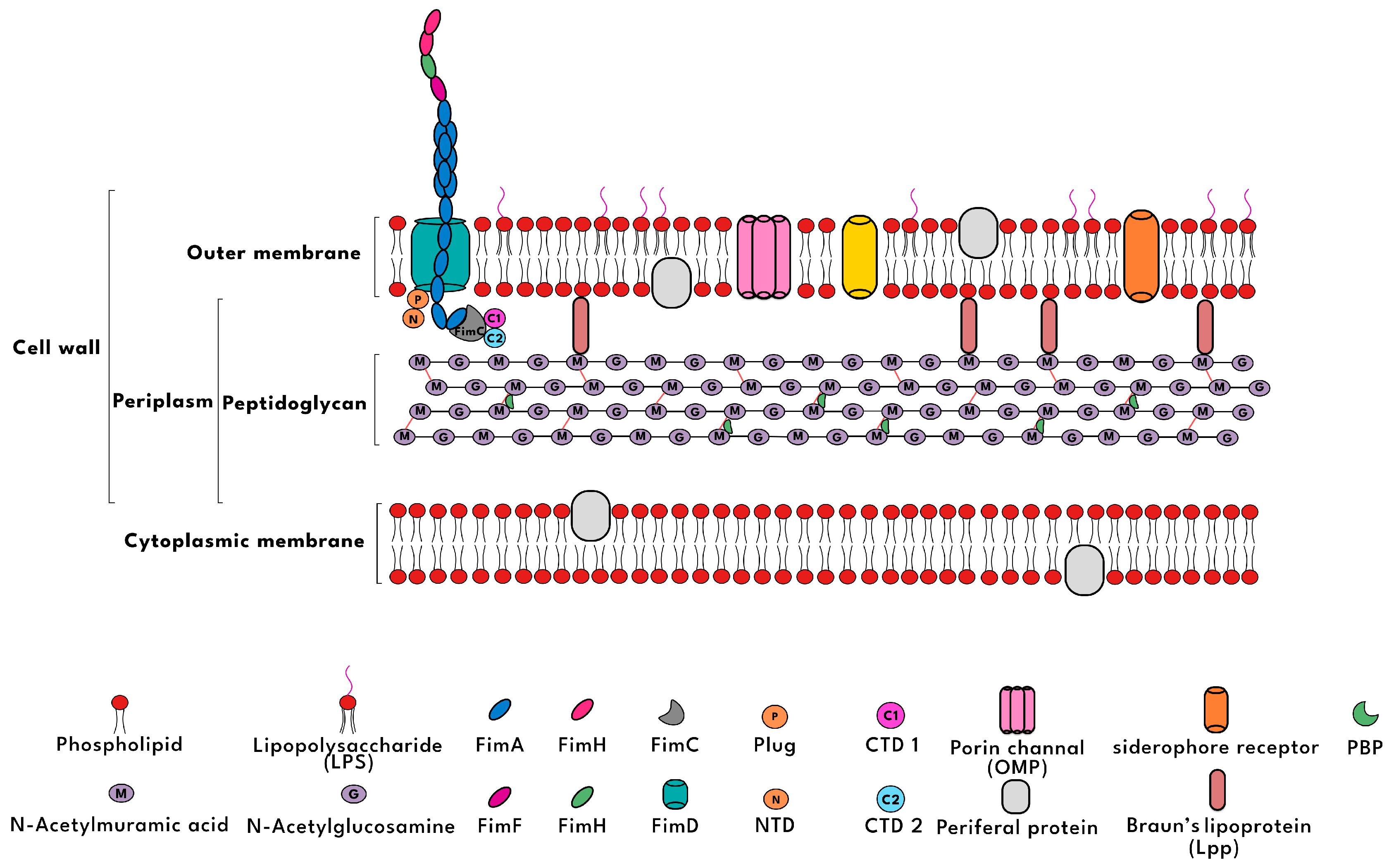 | β-lactams and Monobactams | Penicillin, Cephalosporins, Aztreonam | Enter through porins (OmpF, OmpC) or passively diffuse | Target peptidoglycan transpeptidase (PBP) to inhibit cell wall synthesis | Effective, depends on porin access |