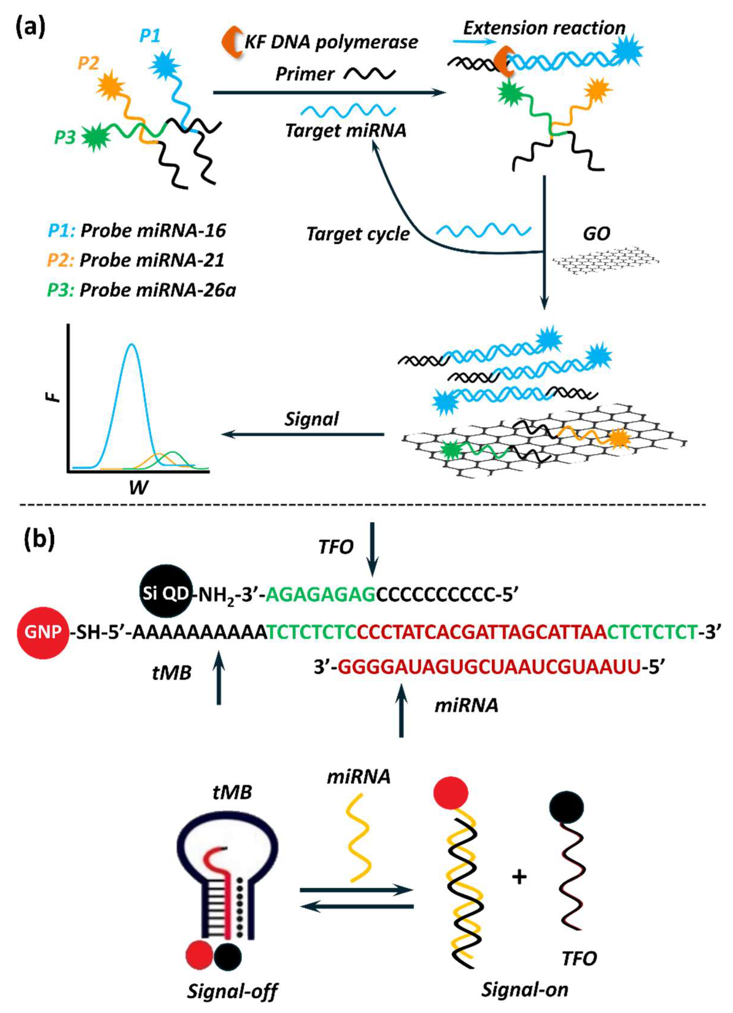 | miR-21 and miR-155 | Cancer | Fluorescence | QDs | LR = 0.1 pM–0.01 nM (both miRNA) LOD = 0.1 pM (both miRNA) Recovery = NR | Required amplification = no Clinical sample validation = yes No labelling required | [283] |