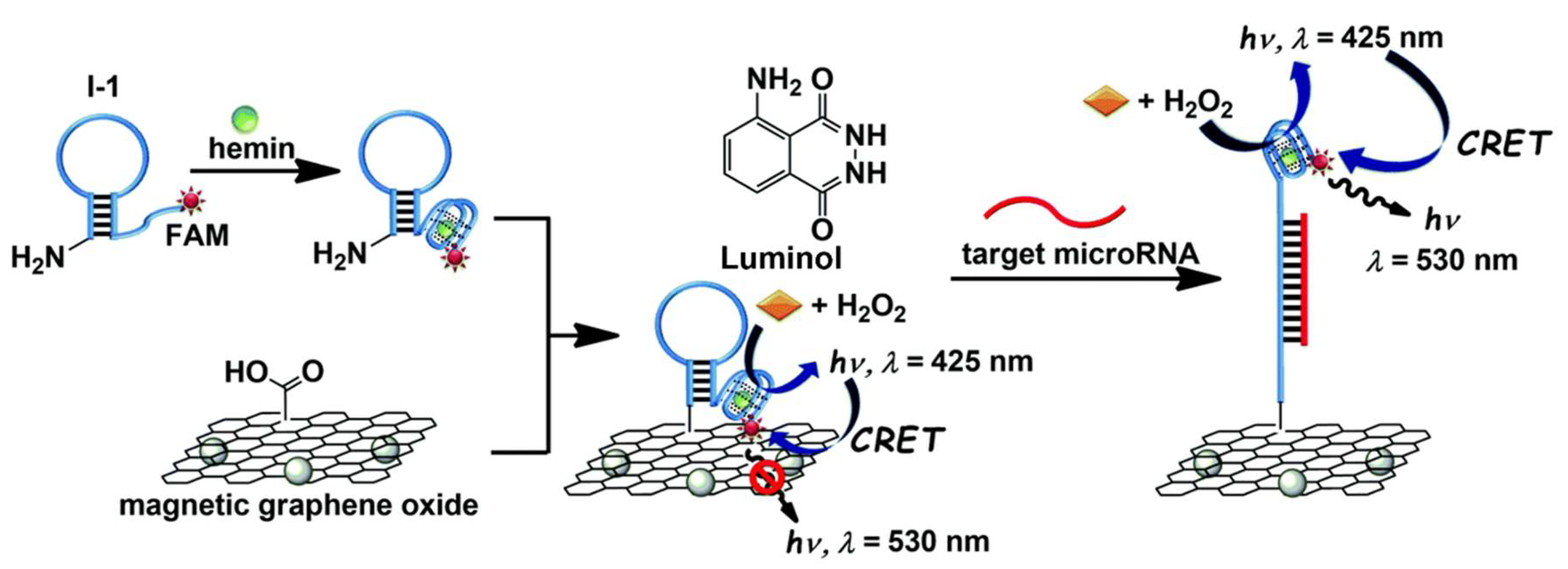 | miR-141 | Cancer | ECL/SPC dual-mode | S-BN QDs and WO3-x nanodots | LR = 10−17–10−10 M LOD = 10−17 M Recovery = 99.0–103% | Required amplification = no Real sample validation = yes | [274] |