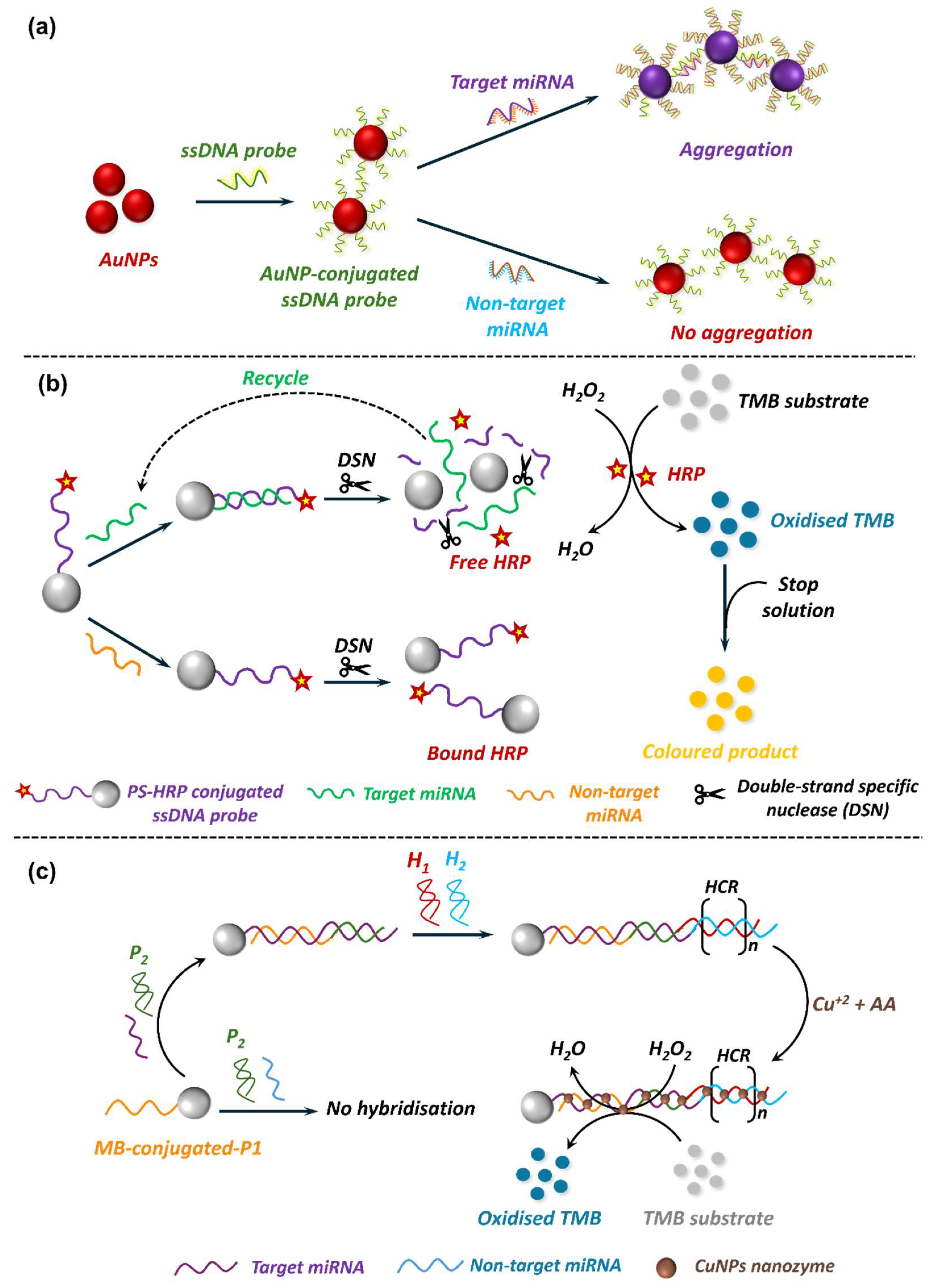 | miR-155 | Cancer | Colourimetric | CuNPs | LR = 80–500 aM LOD = 22 aM Recovery = 98.8–103.4% | Required amplification = yes Real sample validation = yes Nanozyme-based detection | [288] |