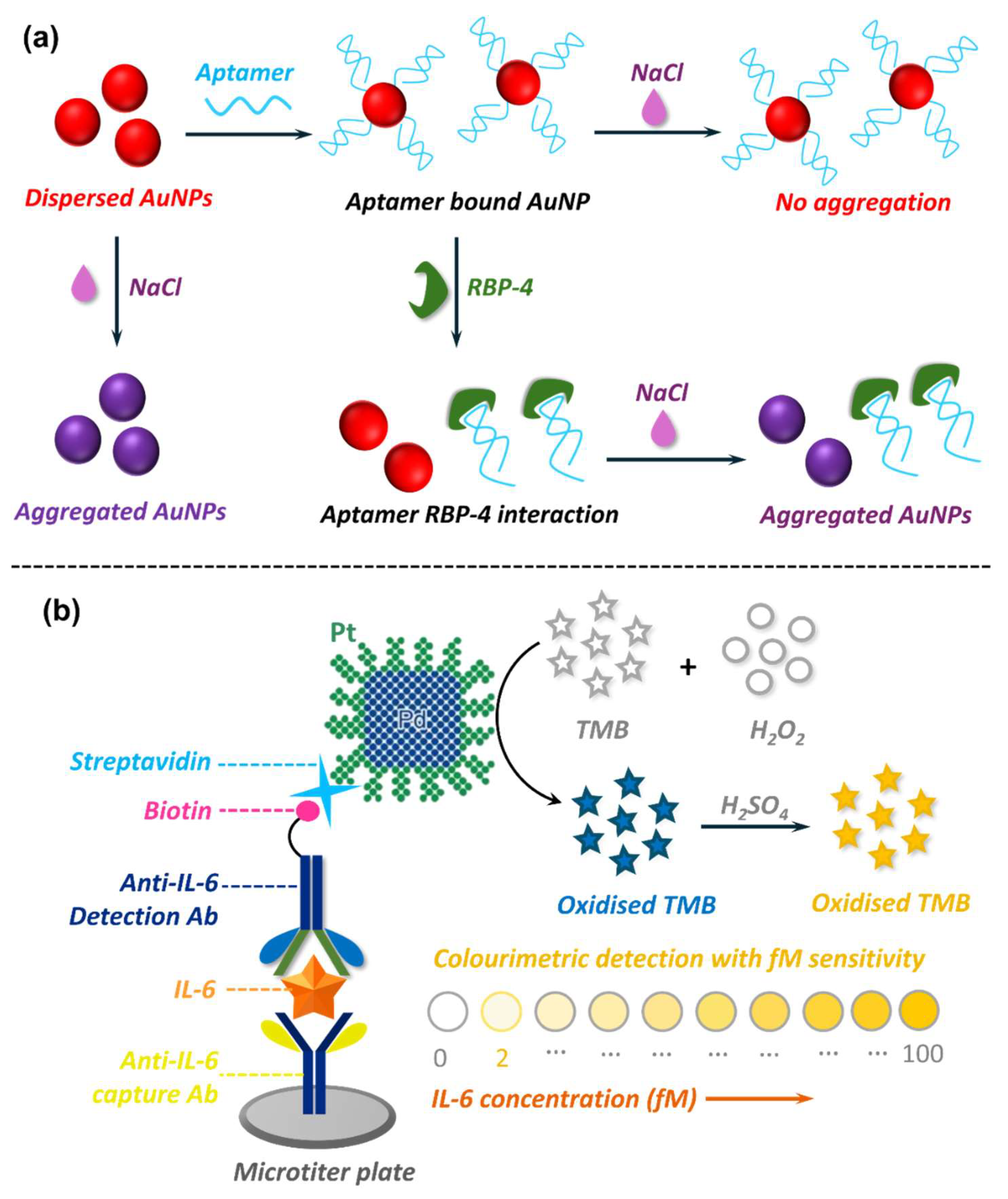 - Gao, Z.; Wang, C.; He, J.; Chen, P. Pd@ Pt Nanodendrites as peroxidase nanomimics for enhanced colorimetric ELISA of cytokines with femtomolar sensitivity. Chemosensors 2022, 10, 359. [Google Scholar] [CrossRef] [PubMed]
