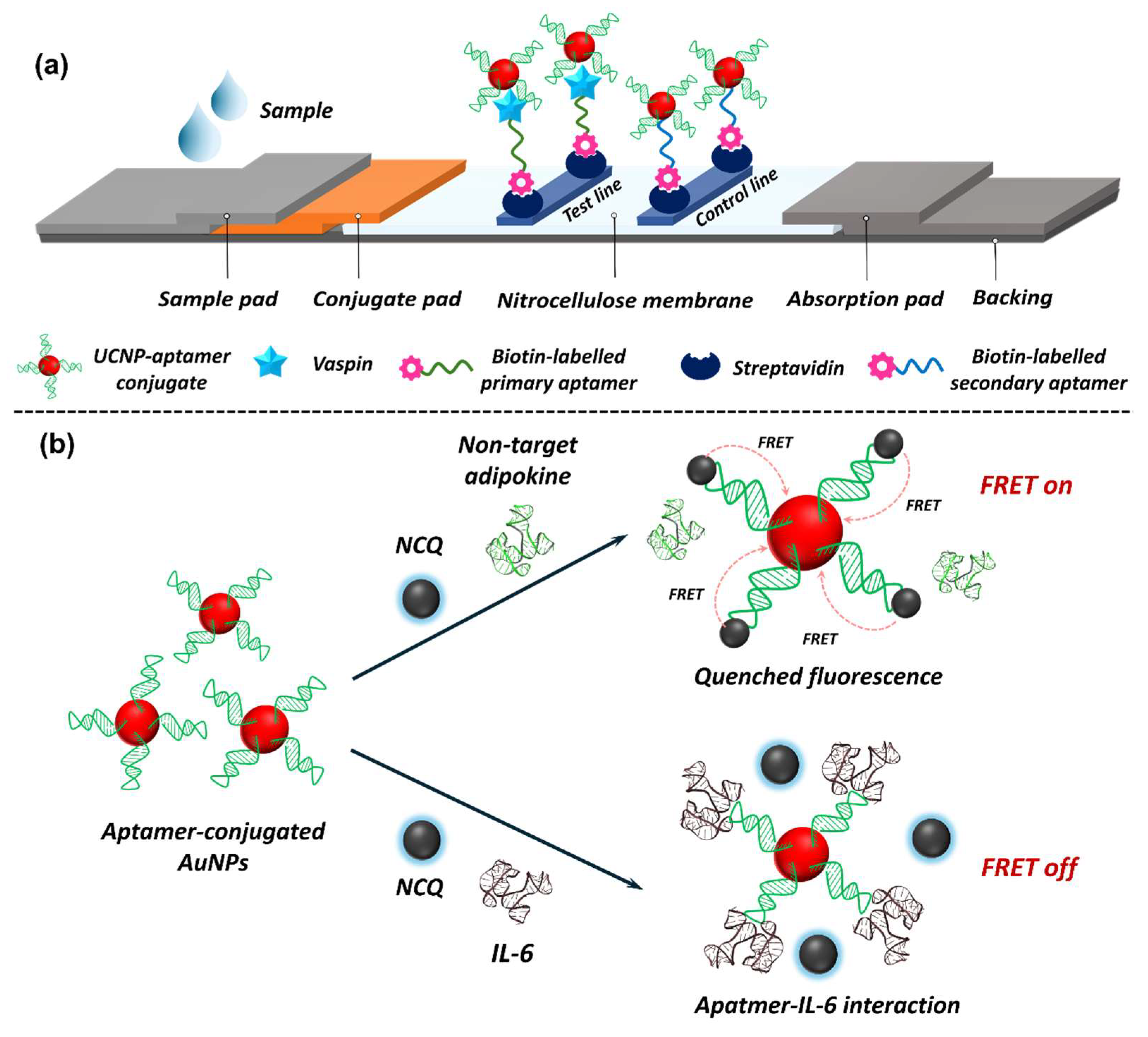 | Vaspin | Obesity and T2D | Fluorescence | UCNPs | LR = 0.1–55 ng/mL LOD = 39 pg/mL Recovery = 96.9–101% | Aptamer pair-based detection on an LFD. Real sample validation matrix was serum. | [328] |