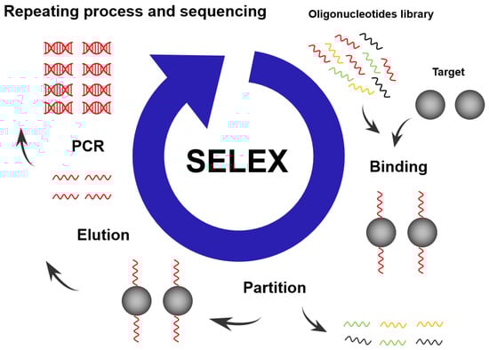 Most aptamers are discovered through a library selection process called Systematic Evolution of Ligands by Exponential Enrichment (SELEX) [1,2]. The working principle of the SELEX is to chemically synthesize a library of single-stranded oligonucleotides as a starting library to incubate with the desired target molecule in vitro to screen for the best aptamer–target binding [27]. The binding of the target with the nucleic acid sequences in the mixture eliminates the nucleic acid sequences that are not bound to the target. Nucleic acid sequences that bind to the target are isolated and amplified using a polymerase chain reaction (PCR) [28,29]. The PCR amplification creates a new pool of nucleic acid sequences, which are then subjected to a subsequent round of the selection process. The initial rounds of screening usually take a longer time, and their screening conditions are more lenient compared to later ones [30]. After the first few rounds of screening, the buffer conditions are usually altered to control the volume of the target–aptamer complex and the binding time of the target to the aptamer to achieve the conditions for creating an aptamer with a high affinity for the target. In addition, the presence of non-specific nucleic acid sequences in the mixture favours the selection of nucleic acid aptamers with a high affinity. At the same time, for some target molecules, the presence of monovalent or divalent cations in buffer solutions can greatly reduce non-specific binding [31]. It is also important to remove non-specific binding sequences from the library using pre-negative selection by incubating the library with the selection matrix, only in the absence of target molecules. After repeated screening and amplification, some nucleic acids that do not bind or have a low affinity for the target reactants are eliminated, and the remaining nucleic acids with a high affinity for the target are isolated. After several rounds of SELEX processes, the purity of nucleic acids with a high affinity for the target is enriched until they occupy the majority of the nucleic acid pool (>90%). As shown in Figure 2, after 5–20 rounds of SELEX selection processes, the selected nucleic acid aptamers with a high affinity to the target were cloned into appropriate vectors and sequenced.